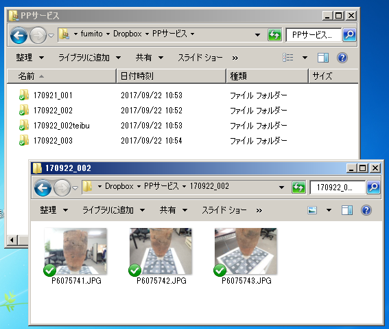 - フォルダ名は「撮影日_土器番号」としてください。例えば撮影日が2017年3月10日、土器番号:No.001の場合、「170310_001」となります。