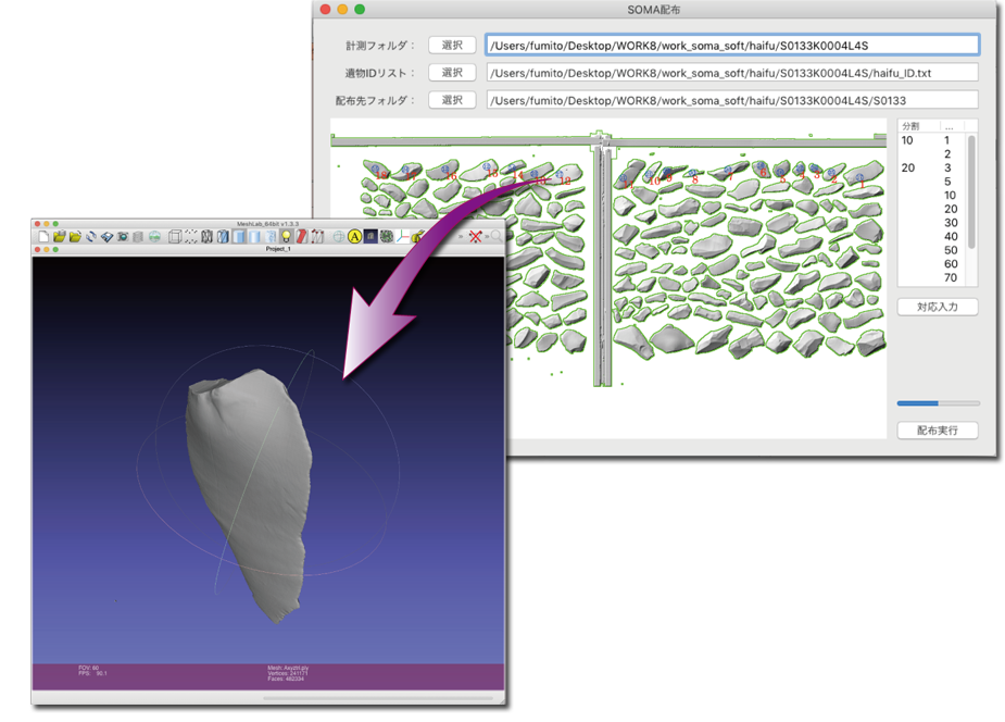 データ処理では、遺物IDと計測データ識別IDとの対応付けを視覚的におこないます。対応付け完了後 [配布実行] ボタンを押すと、遺物ID名のフォルダを自動で作成し、そのフォルダの中に関連ファイルを自動格納します。このファイル群の中にPLY形式の3Dデータが作成され、3Dビューワで表示することができます。