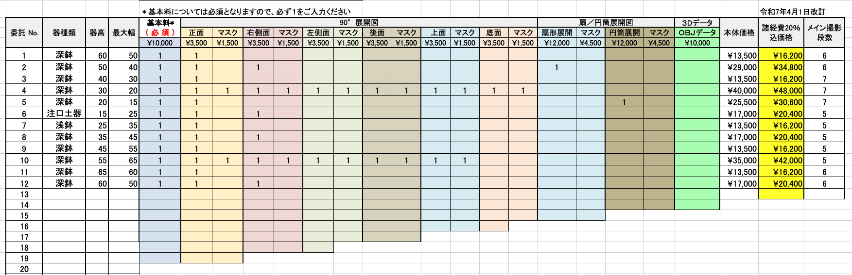 土器を抽出した段階で、PPサービスの対象とする委託リストの作成をおこなってください。委託リストをダウンロードし、このページの「PPサービスのPEAKIT仕様」を参照しながら、以下の方法にしたがって入力されますと、右側の「金額」に積算金額が表示されます。委託資料の選択、数量の調整にご活用下さい。