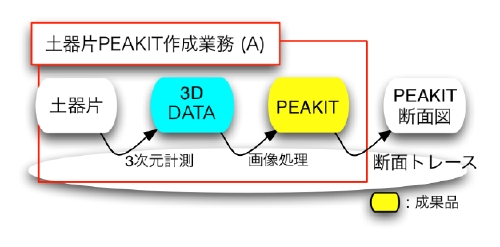 土器片PEAKIT作成サービスとは、お預かりした土器片から「PEAKIT」を作成して納入するサービスです。土器片PEAKIT作成サービスは、徹底した機械化により半自動化を達成しているため、3次元計測サービスとしては低価格で、工期も短いという利点があります。報告書作成の業務全体を効率的に進められる画期的な手法としてご好評頂いています。