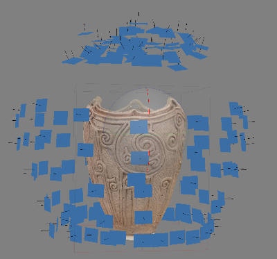 下端部の撮影は、土器が接地しているため、真下からまわりこむように撮影することはできません。そこで、メイン撮影におけるカメラの軌道16方位の中間を埋めるようにカメラ位置を半分ずらし、横の写真同士でオーバーラップを追加していきます。こうしてメイン撮影各列下段写真のオーバーラップ率を上げることができます。