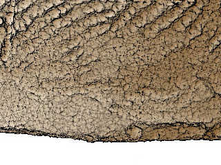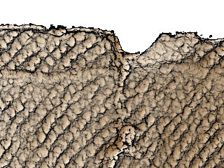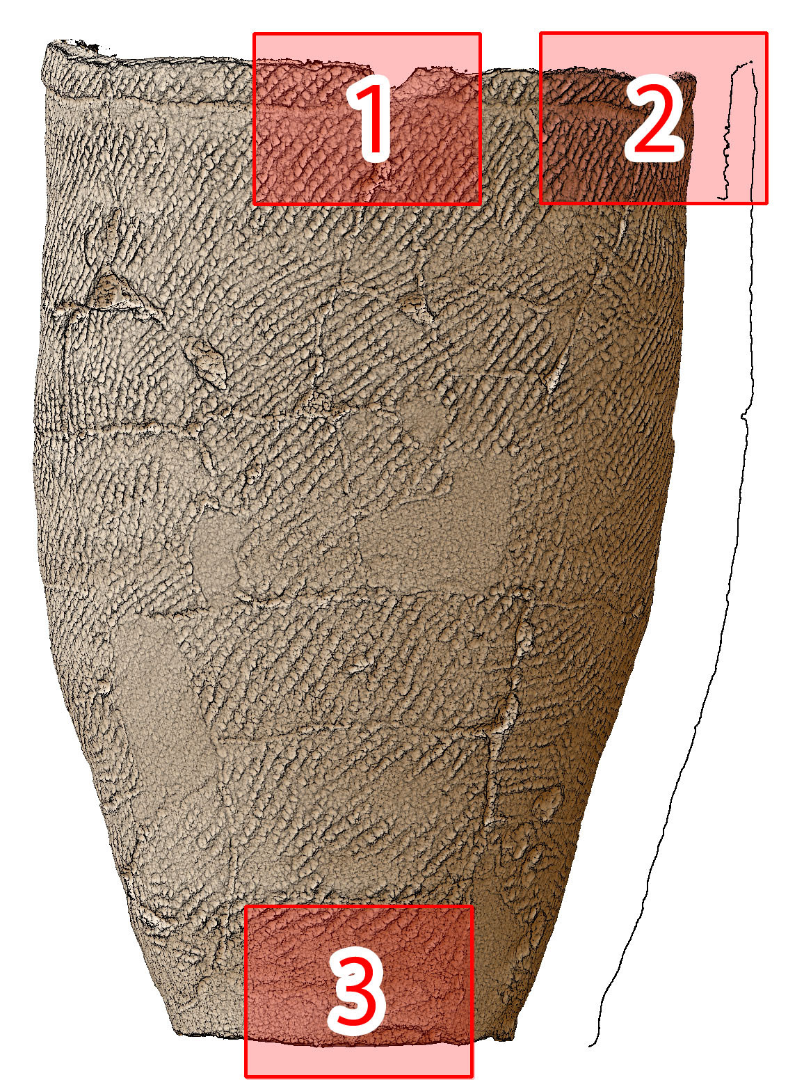 そして、土器の下部(範囲3)を拡大します。縄文の施文されていない部分は実際は滑らかな器面なのですが、ザラザラしているように表現されてしまいます。