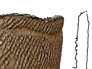 断面上部(範囲2)の拡大画像です。「メイン撮影のみ」で見られたデータの乱れは解消し、口縁の断面ラインが忠実に再現されます。