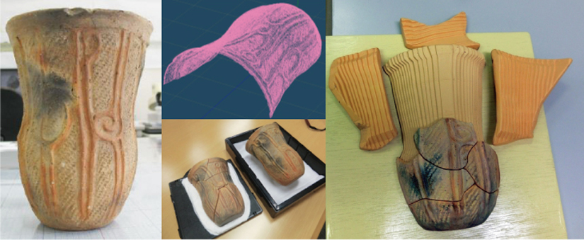 昨年盛岡市遺跡の学び館様より、出土土器を複数のピースに分割した形で復元し、来館いただいたみなさんに触って楽しんでいただける土器パズルができないか、とのご要望をいただき、今野先生はじめ「MMM:エムキューブ」に参加する学生の方々のお力も得て、試作を重ねて参りました。